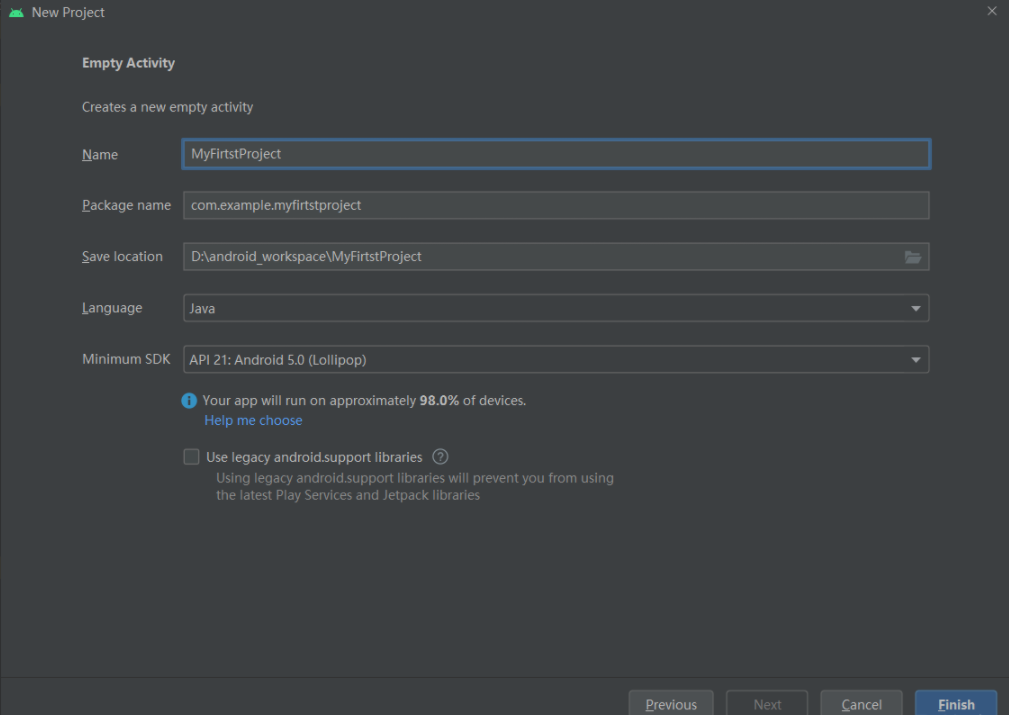 【摘要】 目录前言一.新建项目二.运行项目前言前几篇文章给大家介绍了一下android的发展历史及基础目录知识,今天我们开始真正的自己新建一个程序并且运行起来!一.新建项目1.打开Android studio2.点击 File->New ->New Project... 3.这里面显示的就是一些Activity的模板,今天先不细说,默认选择Empty Acitvity。4.给我...