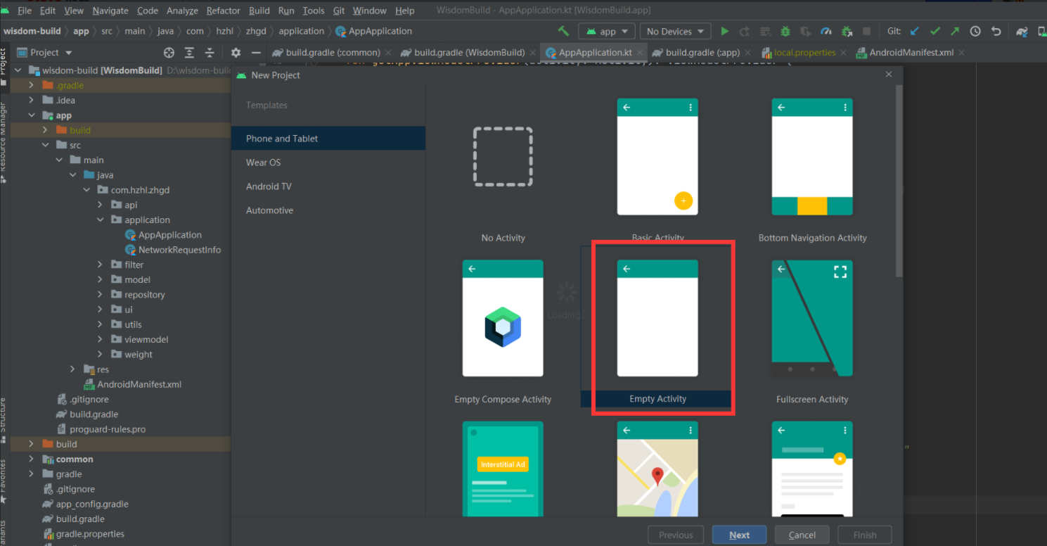 3.这里面显示的就是一些Activity的模板,今天先不细说,默认选择Empty Acitvity。