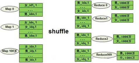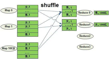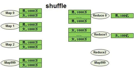 主要应用在发生倾斜的任务中。数据倾斜的情况相信大家也经常遇到,如mapreduce任务进度长时间等待在99%或者一些内存溢出的情况等。产生数据倾斜的原因有很多种,倾斜的原理是很多相同的key用同一个reduce处理,导致处理的任务过大,如共有200亿数据,有100亿为男生 100亿为女生,如图只有两个reduce处理数据:
