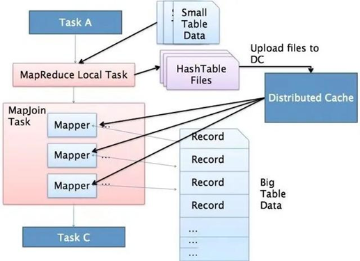 1)先启动Task A;Task A启动一个MapReduce的local task;通过该local task把small table data的数据读取进来;之后会生成一个HashTable Files;之后将该文件加载到分布式缓存中;