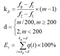 能量聚度是表示在峰值频率附近的能量聚集程度的参数。设随机信号序列{x(i),i=0, 1, 2, …, N-1}的功率谱为p(i),i = 0, 1, …, m-1,对应的频率范围为[f1,f2],q(i)是p(i)的归一化功率谱,fp是峰值频率,那么能量聚度(Ec)计算如下: