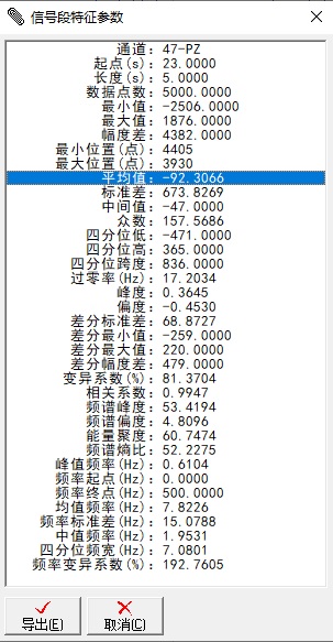 菜单操作:《分析》→《通用分析》→《概要统计》,对当前通道当前段信号进行概要统计,即提取一些参数来描述这段信号的特点。包括如下特征参数: