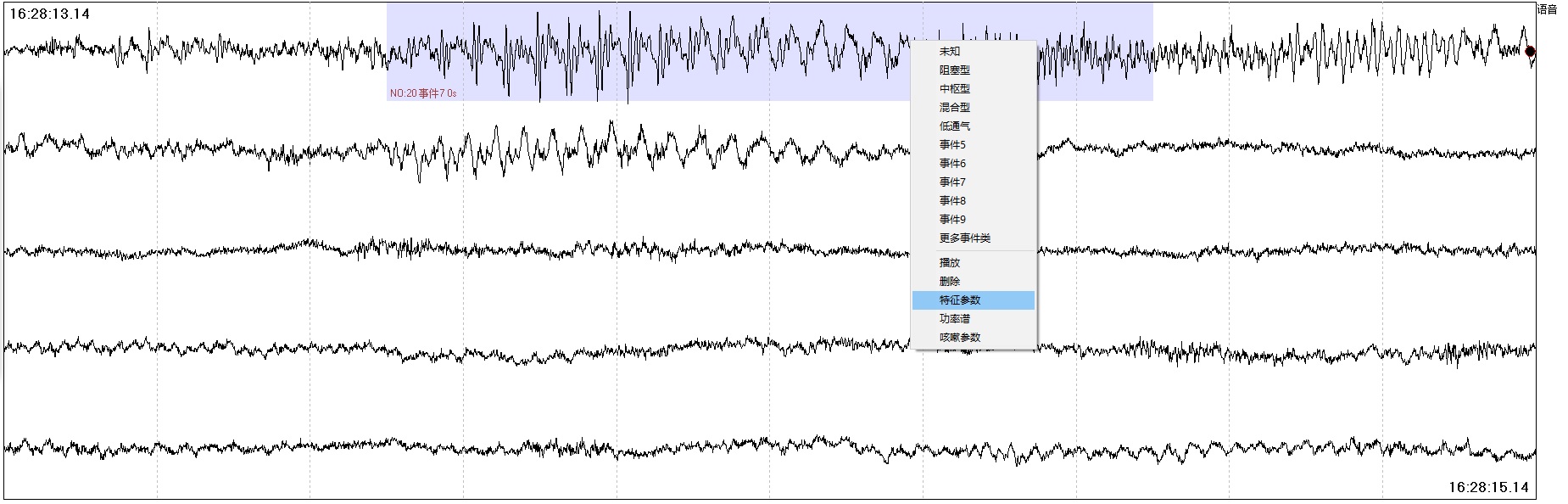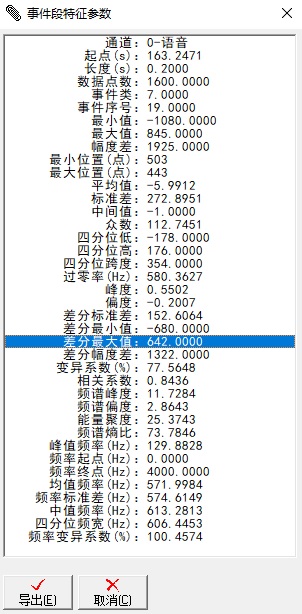 例2:事件段信号的特征参数计算,在声音信号中的一个事件段中点击鼠标右键弹出菜单,选择“特征参数”菜单项,计算该事件段的特征参数。