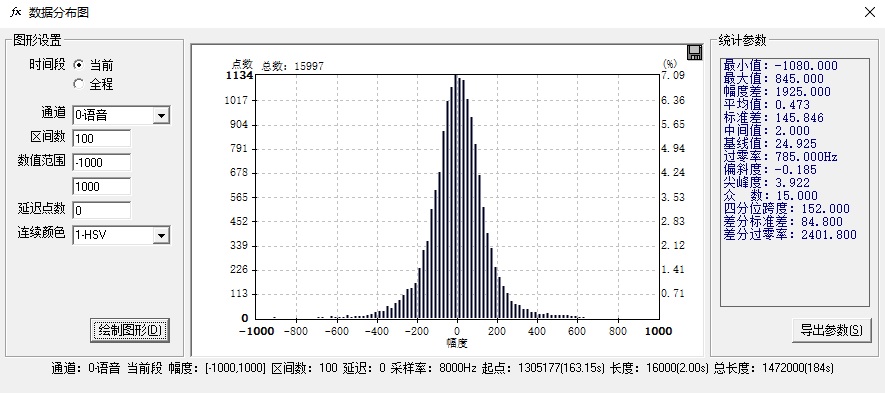 在信号幅度分布直方图中,可以设置直方图绘制的参数,显示信号的特征参数,以及导出参数,导出文件为:\Features\feaHistWave.csv。
