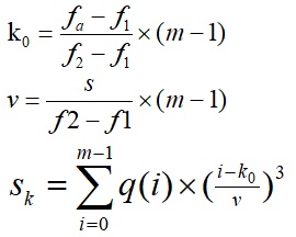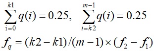 设随机信号序列{x(i),i=0, 1, 2, …, N-1}的功率谱为p(i),i = 0, 1, …, m-1,对应的频率范围为[f1,f2]。q(i)是p(i)的归一化功率谱,寻找k1和k2使q(i)的两端之和为0.25,那么四分位频宽fq为:
