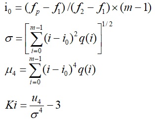 设随机信号序列{x(i),i=0, 1, 2, …, N-1}的功率谱为p(i),i = 0, 1, …, m-1,对应的频率范围为[f1,f2],q(i)是p(i)的归一化功率谱,fp是峰值频率,频谱峰度(Ki)定义为,