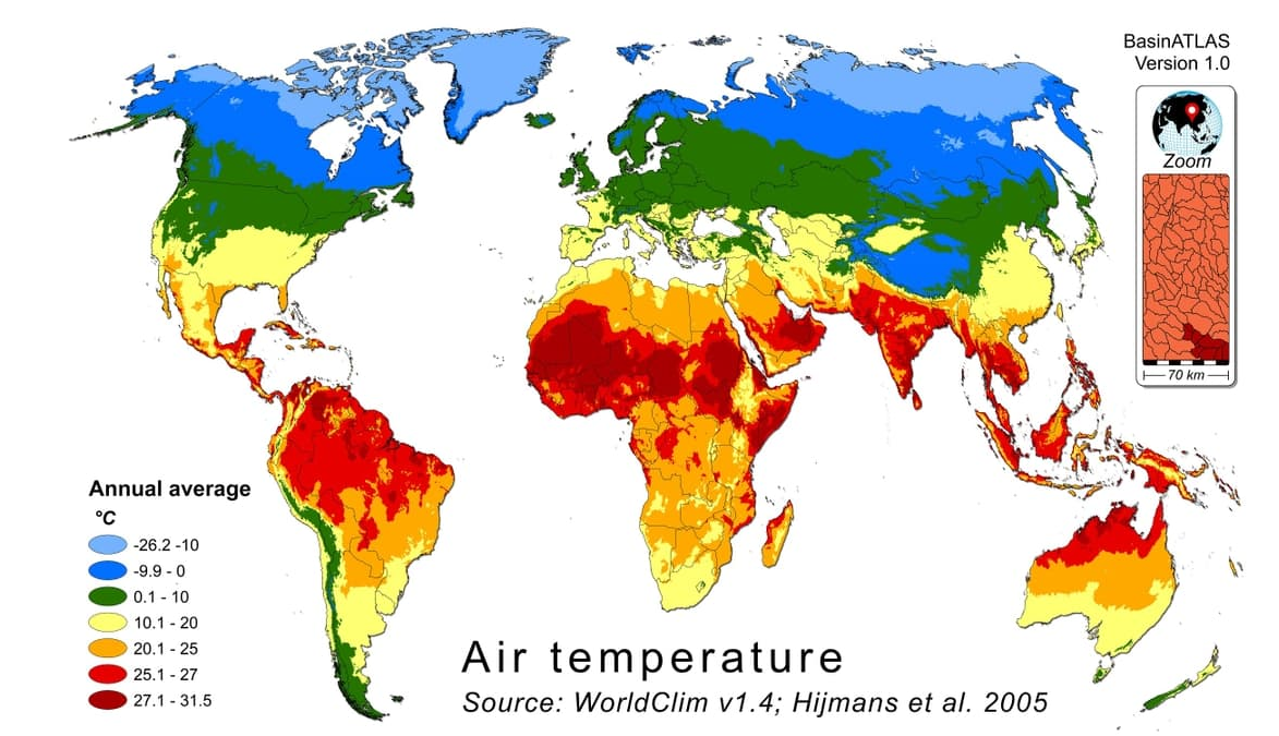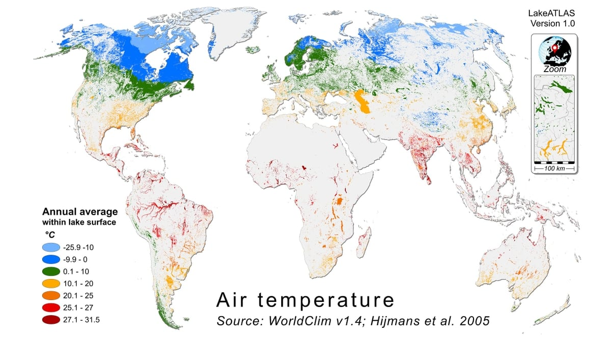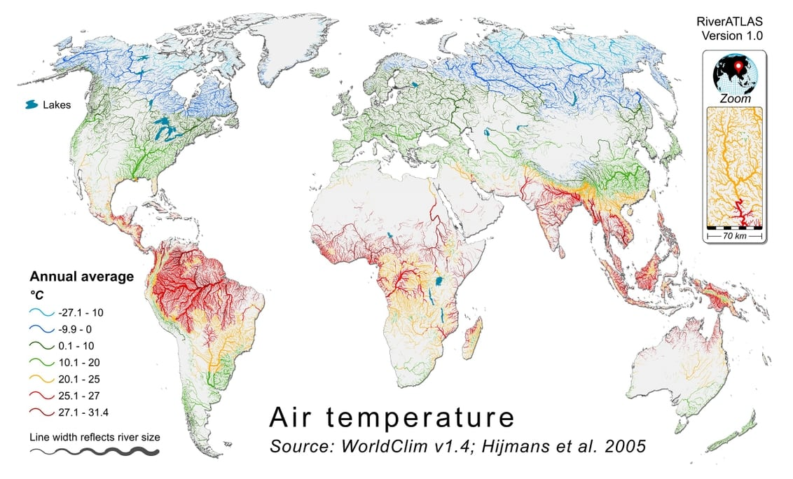 HydroATLAS 为 HydroBASINS 的所有子流域、HydroRIVERS 的所有河流以及(即将推出)HydroLAKES 的所有湖泊多边形提供了全球水文环境特征概要。
