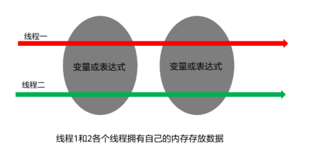 创建一个变量之后,如果每个线程访问的都是自己的变量,这样就不会产生不安全的问题,如下图所示,线程一和线程二都有自己的内存来存放数据,这样就避免了不安全问题。