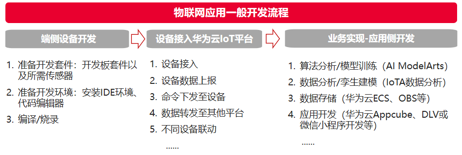 本赛题重点在于IoT和智能,利用物联网产品、技术让“物”变得智能,场景智能化、数字化,进而让现实生活场景智能化。一般物联网开发分为以下三步: