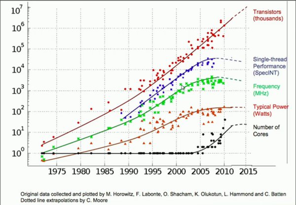 因此,由于散热导致处理器的频率不能接着提升,硬件生产商转而采用将多个处理器组成到一个芯片上,这称为多核;为了提供更高性能的处理器,处理器硬件生产商通过增加寄存器的宽度和指令的宽度来同时处理多个数据,这称为向量化。