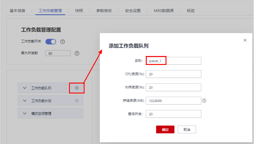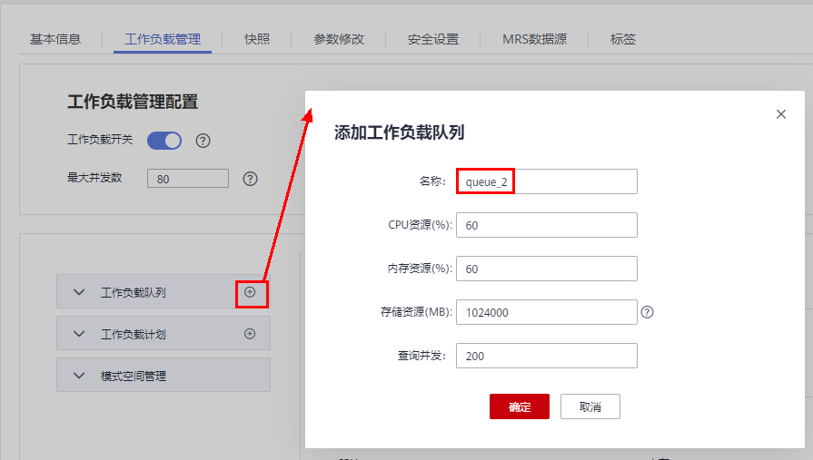 - 登录 GaussDB(DWS) 管理控制台,在集群列表中单击集群名称,切换至“工作负载管理”页签,单击工作负载队列旁的“+”符号添加队列,分别创建报表业务负载队列 queue_1 和核心交易负载队列 queue_2: