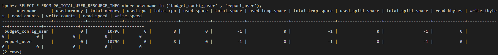 SELECT * FROM PG_TOTAL_USER_RESOURCE_INFO where username in ('budget_config_user' , 'report_user');