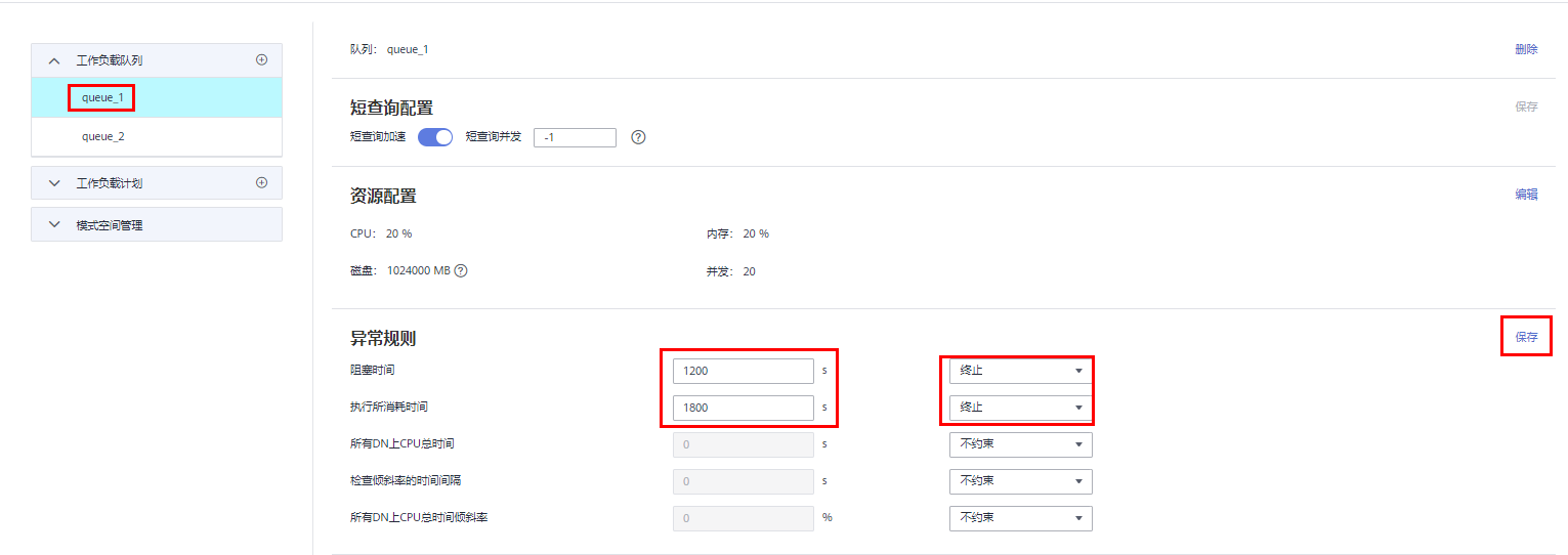 - 修改异常规则:单击创建好的 queue_1 队列,在异常规则中,修改“阻塞时间”和“执行所消耗时间”分别为 1200s 和 1800s,然后保存(修改 queue_2 同理):