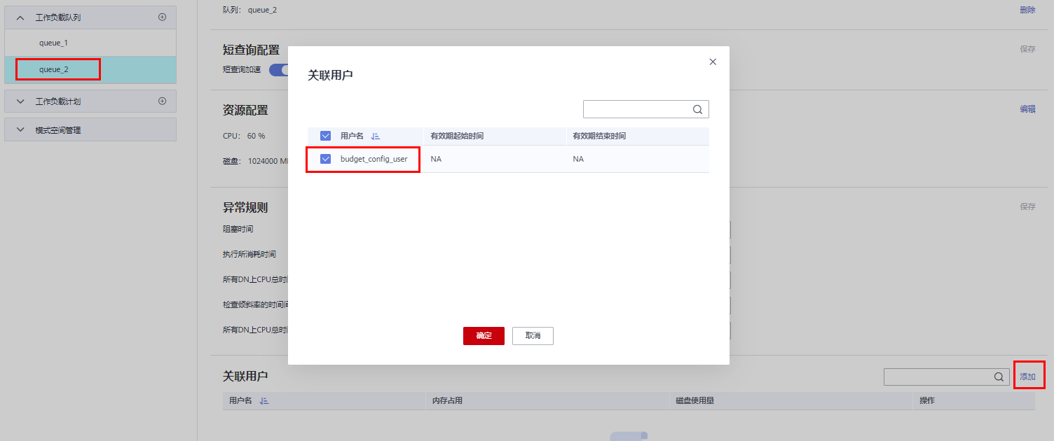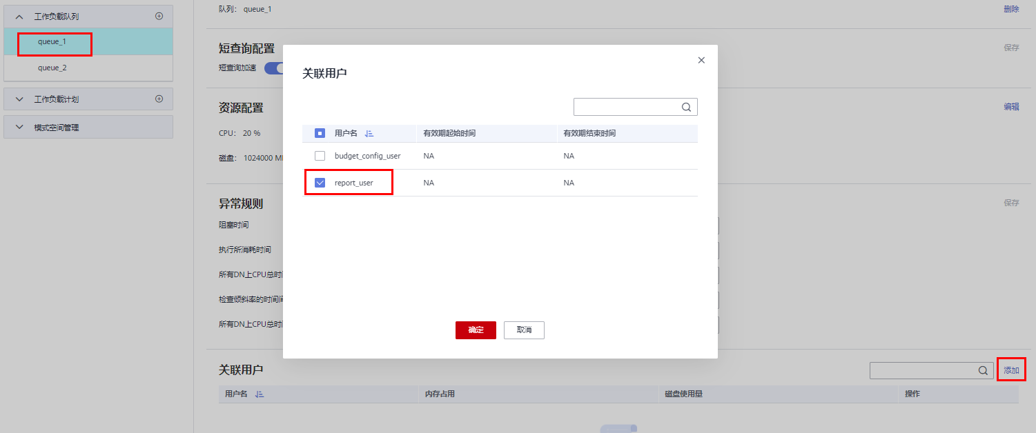 - 关联用户,点击“queue_1”队列 -> “关联用户”右侧的“添加”,勾选报表业务对应的用户 report_user,然后确定(同理,将核心交易的用户 budget_config_user 添加入 queue_2 的队列中):