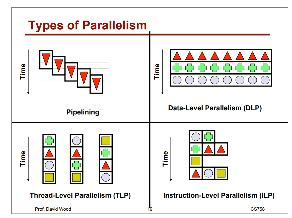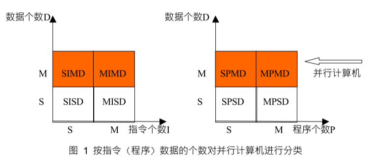 - [大粒度]按同时执行的程序和数据的不同 又提出了SPMD Single-Program Multuple-Data 单程序多数据并行计算机和MPMD Multiple-ProgramMultiple-Data 多程序多数据并行计算机