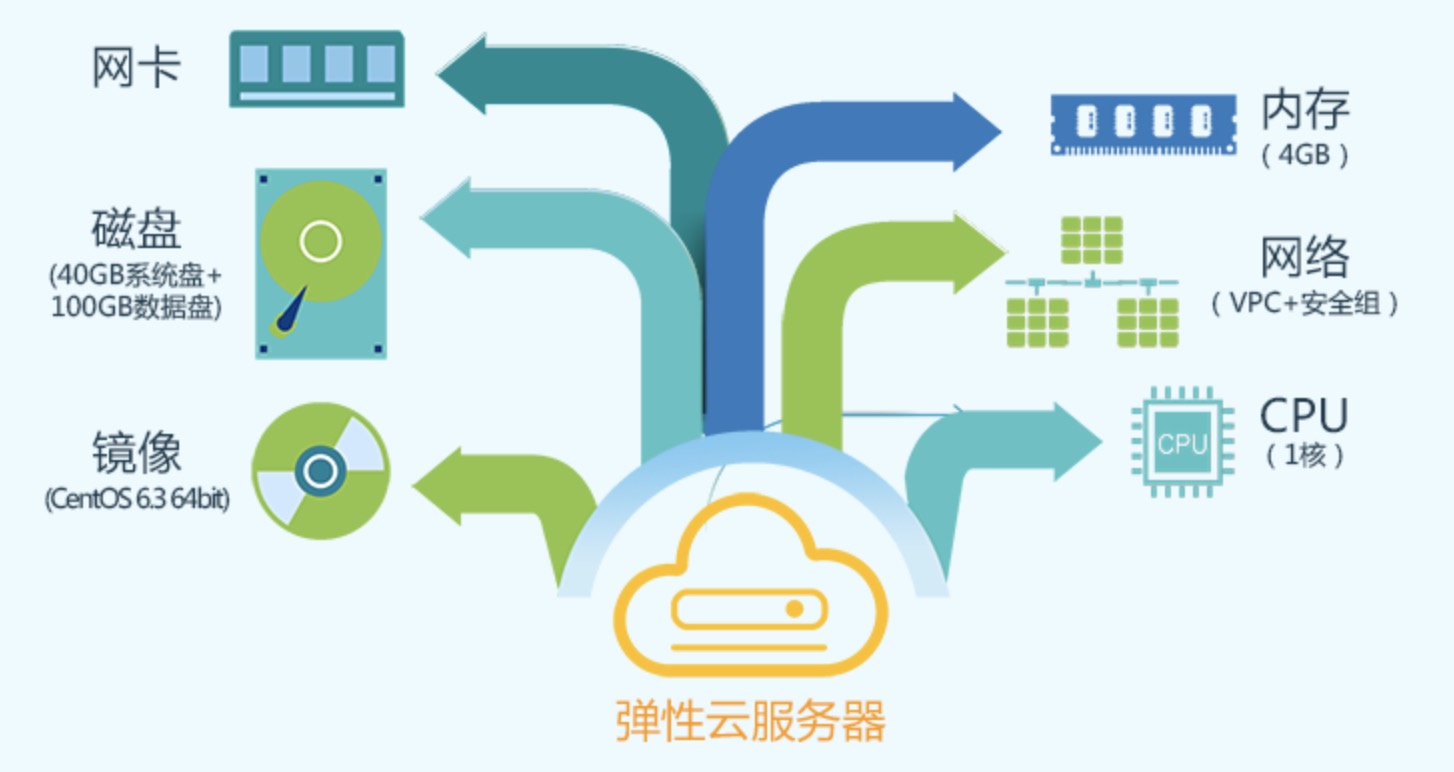 - ECS 通过和其他产品、服务组合,弹性云服务器可以实现计算、存储、网络、镜像安装等功能;