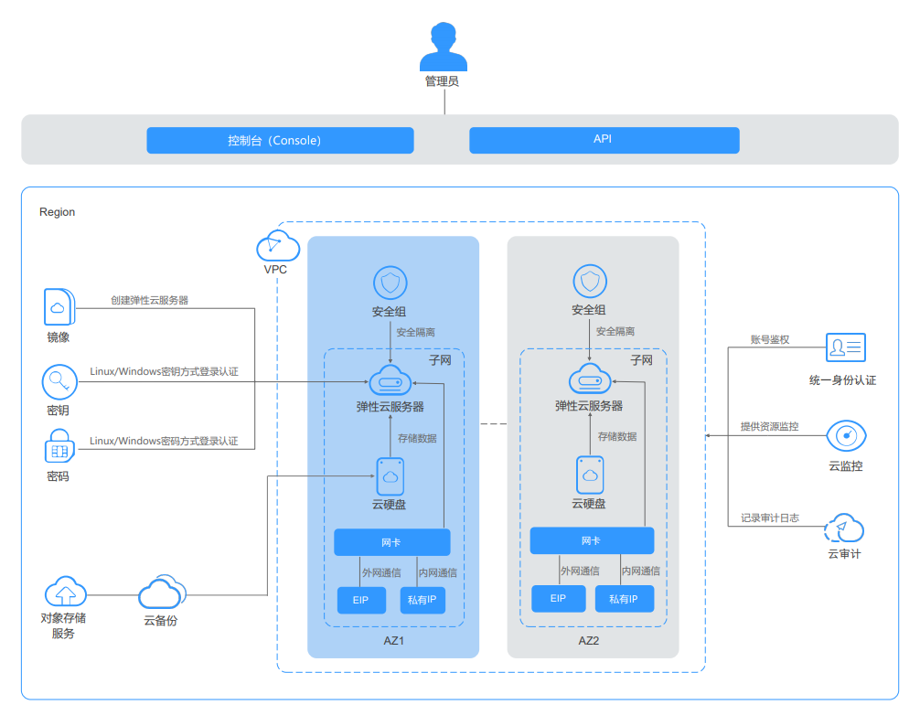 - 通过云硬盘服务实现数据存储,并通过云硬盘备份服务实现数据的备份和恢复。