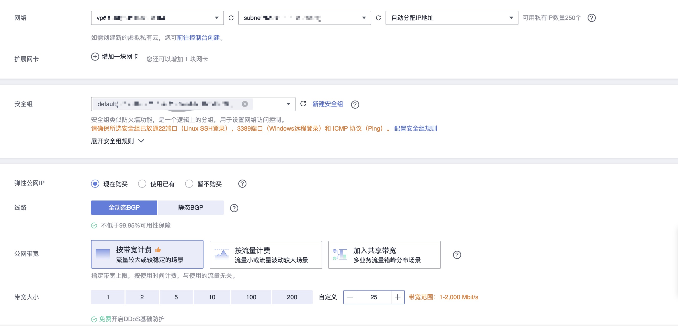 - 如果有访问互联网的需求,弹性云服务器需绑定弹性公网 IP,单击“现在购买”,系统将自动分配弹性公网 IP 给云服务器: