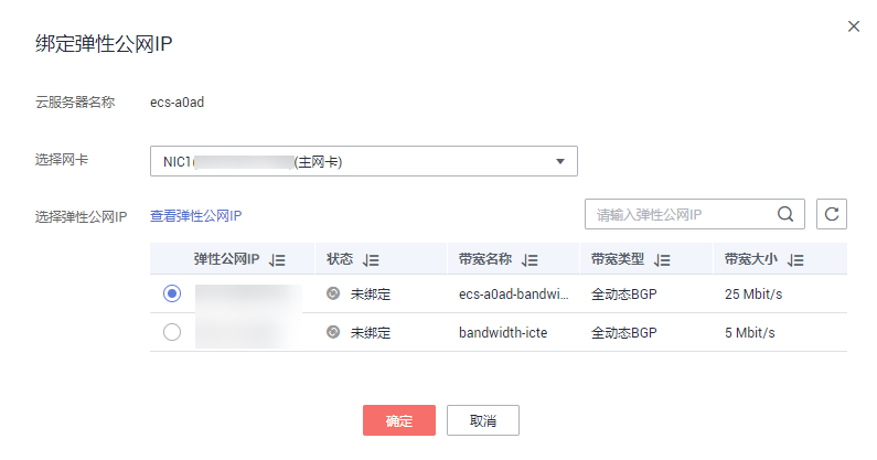 - 选择主网卡与弹性公网 IP,并单击“确定”。