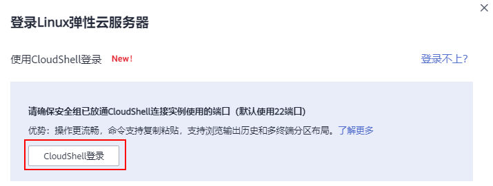 - 在弹出的“登录 Linux 云服务器”窗口中,单击“CloudShell 登录”;