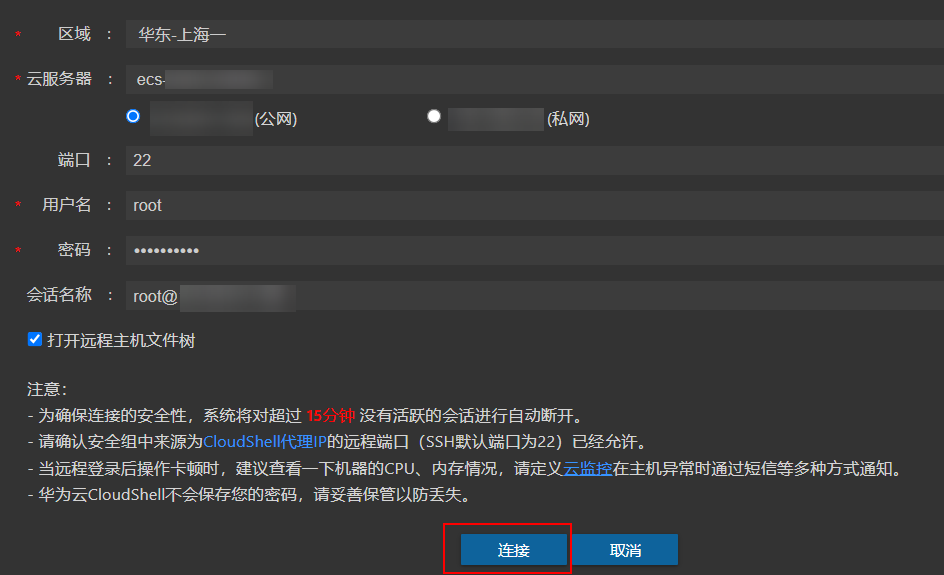 - 单击“连接”登录云服务器。