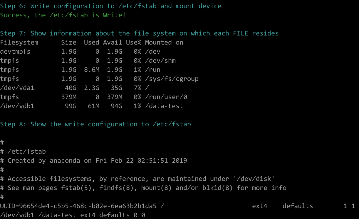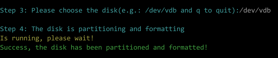 - 当云服务器挂载了一块新的数据盘时,使用 fdisk 分区工具将该数据盘设为主分区,分区形式默认设置为 MBR,文件系统设为 ext4 格式,挂载在 “/mnt/sdc” 下,并设置开机启动自动挂载。