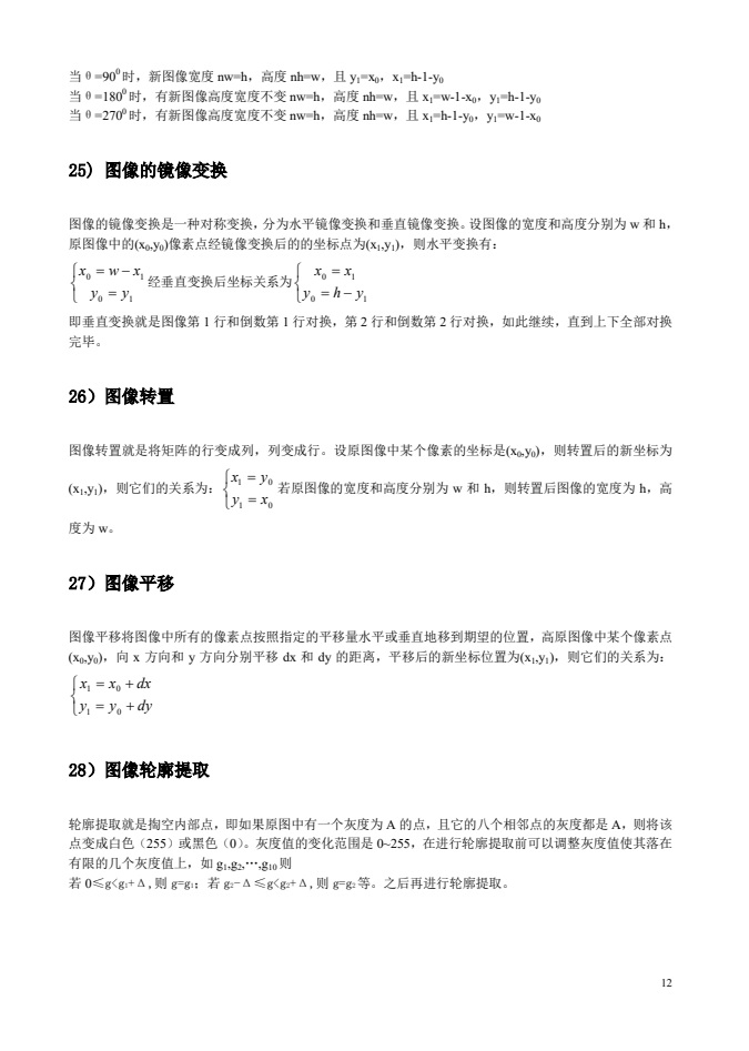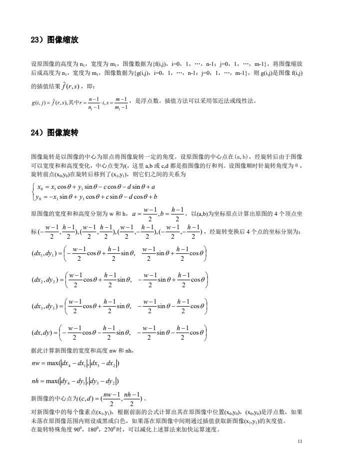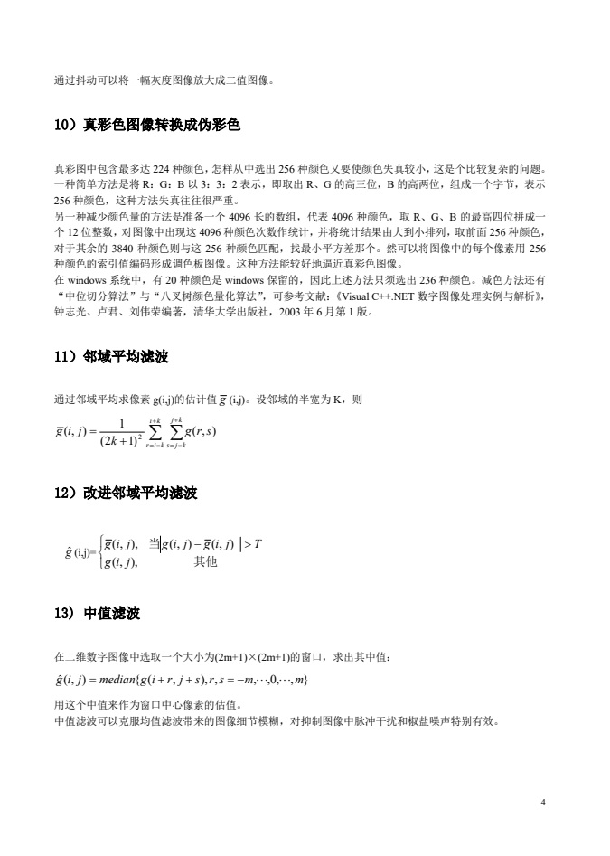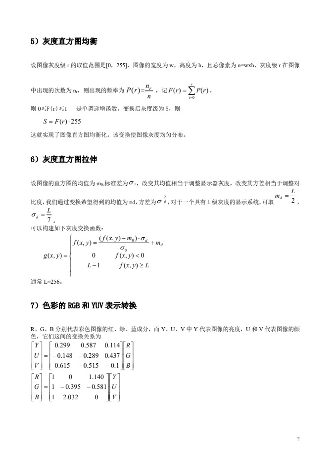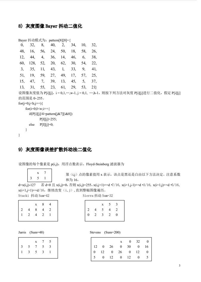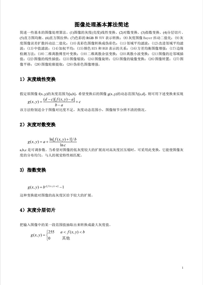 基本图像处理算法简述。(1)图像的灰度(亮度)线性变换、(2)对数变换、(3)指数变换、(4)分层切片、(5)直方图均衡、(6)直方图拉伸;(7)色彩的RGB和YUV表示转换;(8)灰度图像Bayer抖动二值化;(9)灰度图像误差扩散抖动法二值化;(10)真彩色图像转换成伪彩色;(11)邻域平均滤波;(12)改进邻域平均滤波;(13)中值滤波;(14)加权平均;(15)颜色HIS和RGB表示的关系;(16)方差均衡图像增强;(17)边缘检测方法;(18)二维离散傅里叶变换;(19)二维离散余弦变换;(20)离散小波变换;(21)图像的近邻域插值;(22)图像的线性插值;(23)图像缩放;(24)图像旋转;(25)图像的镜像变换;(26)图像转置;(27)图像平移;(28)图像轮廓提取;(29)伪彩色图像增强。