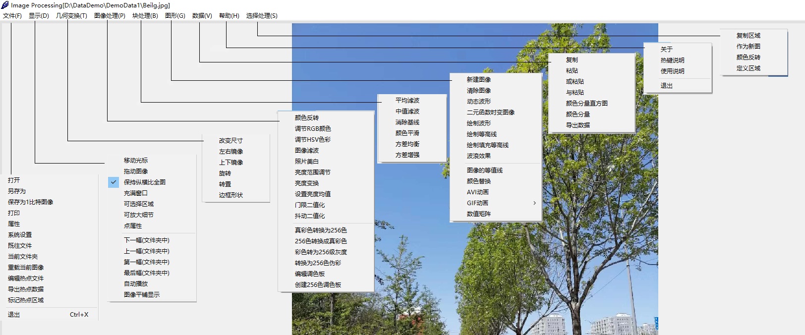 【图像处理】颜色反转;调节RGB颜色;调节HSV颜色;图像滤波;照片美白;亮度范围调节;亮度变换;设置亮度均值;门限二值化;抖动二值化;真彩色转换为256色;256色转换为真彩色;彩色转换为256级灰度;转换为256色伪彩;编辑调色板。