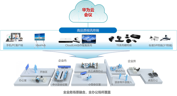 支持华为云会议软硬件终端、第三方硬件终端多种会议终端接入,满足各类会议场景。