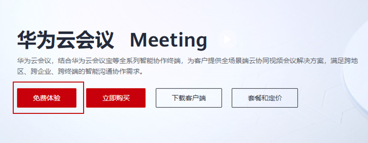 - 在华为云会议产品首页单击“免费体验”,进入注册页面。