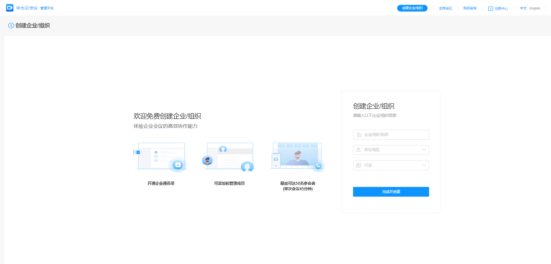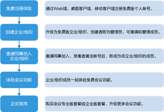 通过Web端、桌面客户端或移动客户端三种方式注册免费版个人帐号。注册成功后,可立即创建会议。
