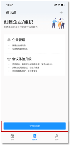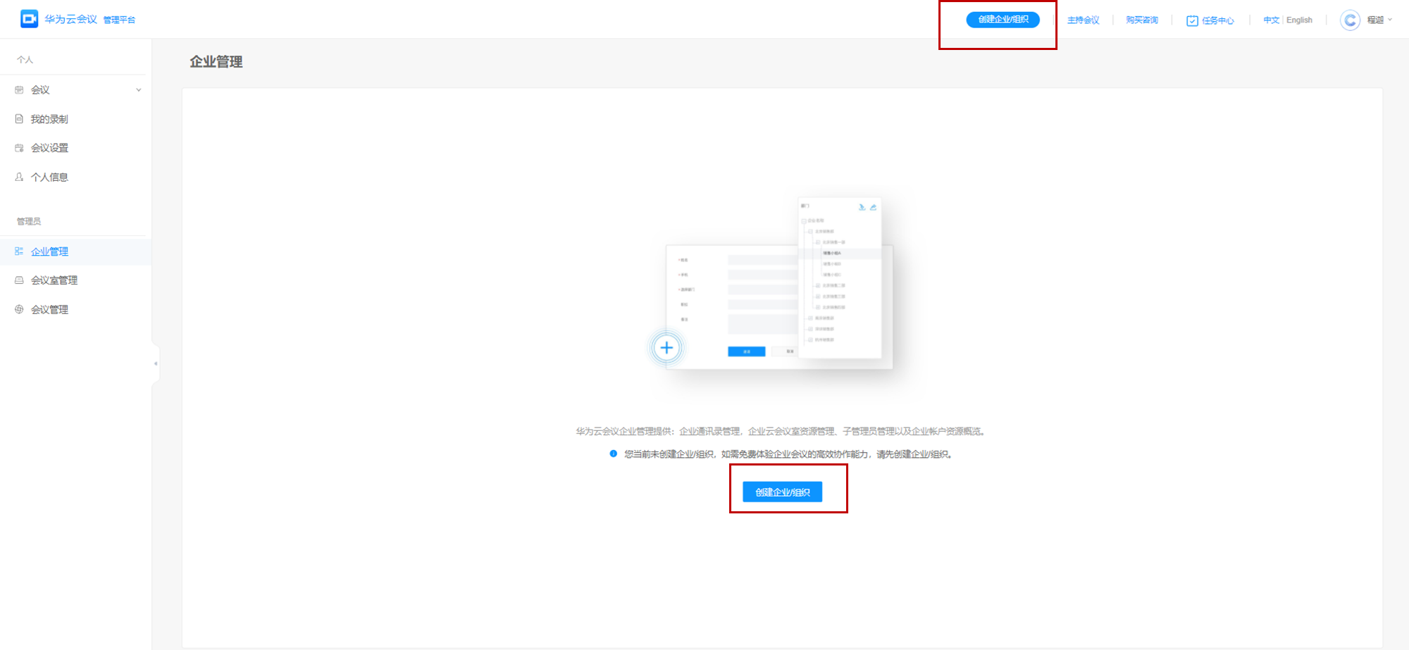 - 在“企业管理”、“终端管理”或“会议管理”页面单击“创建企业/组织”。