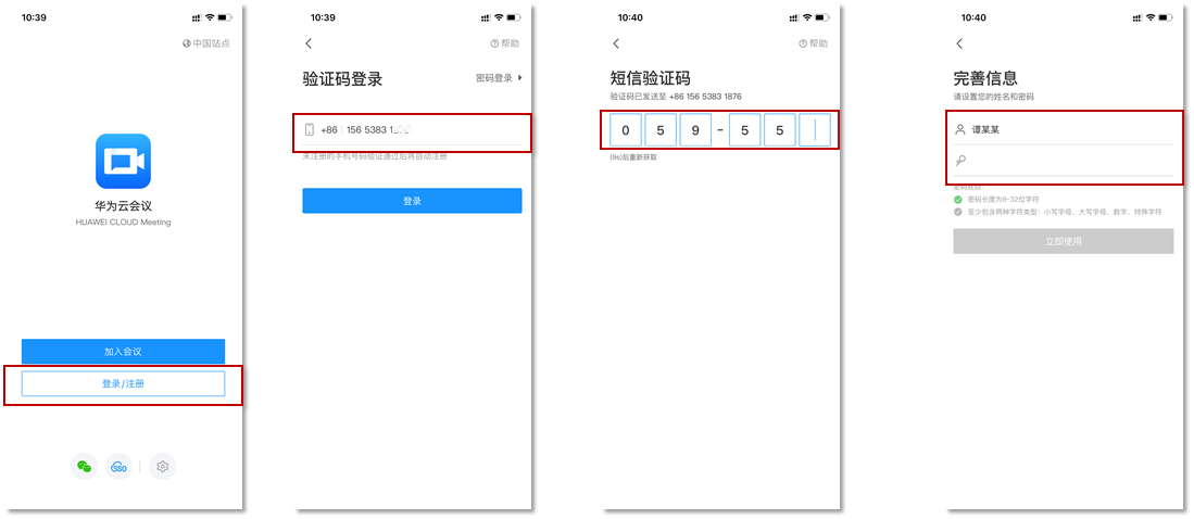 与会者没有华为云会议帐号时,下载软终端,从会议发起人或其他与会者获取会议ID后,输入会议ID(和会议密码),即可匿名入会。
