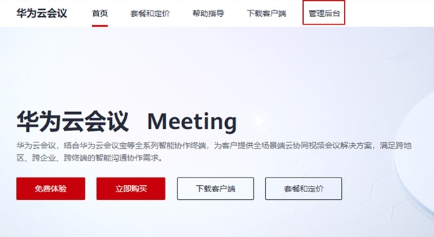 - 使用华为云账号通过华为云会议产品首页进入管理平台。