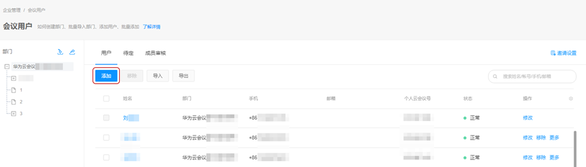 - 选择“企业管理 > 会议用户”,单击“添加”。