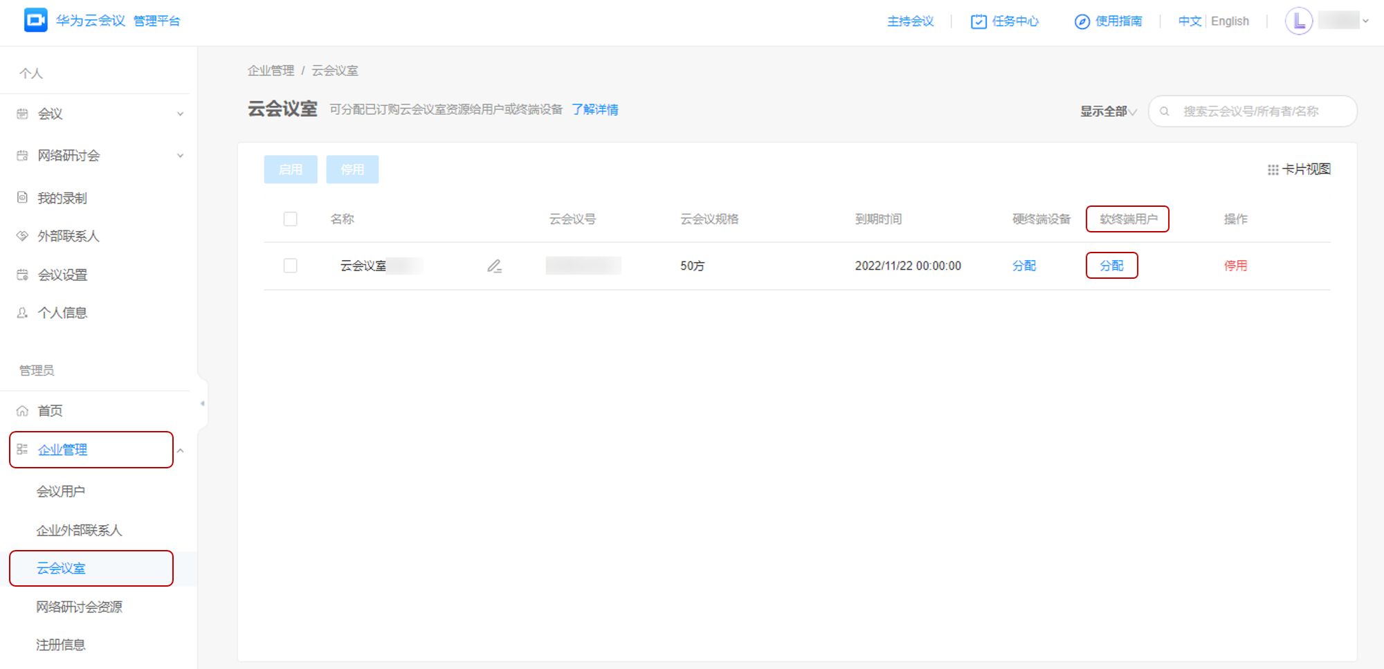- 进入“企业管理 > 云会议室”页面,点击云会议室右侧“软终端用户”列中的“分配”按钮。