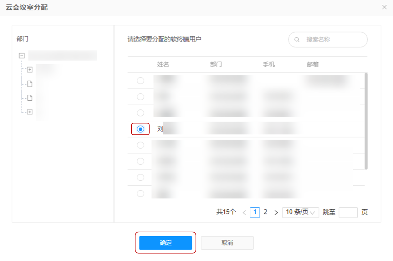 2. 在“云会议室分配”窗口,选择指定的用户。