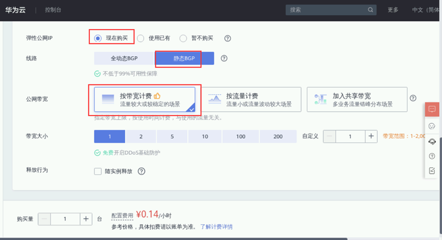 ④ 弹性公网IP:现在购买,