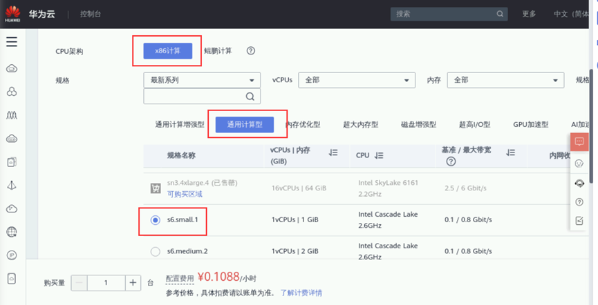 ⑤ 规格:通用计算型,s6.small.1 | 1vCPUs | 1GB,