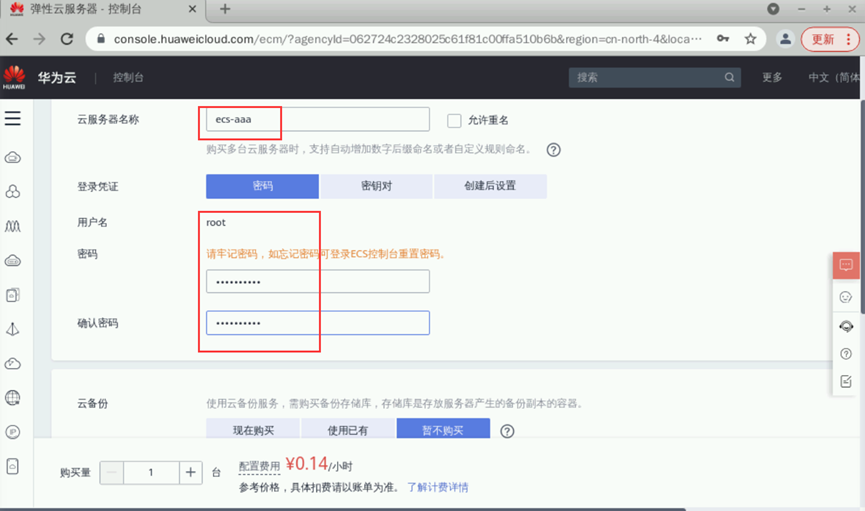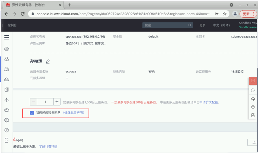 进入华为云“控制台”,鼠标移动到页面左侧菜单栏,点击服务列表->“计算" -> "弹性云服务器ECS”,进入云服务器控制台点击“购买弹性云服务器”,进入创建页面,配置参数: