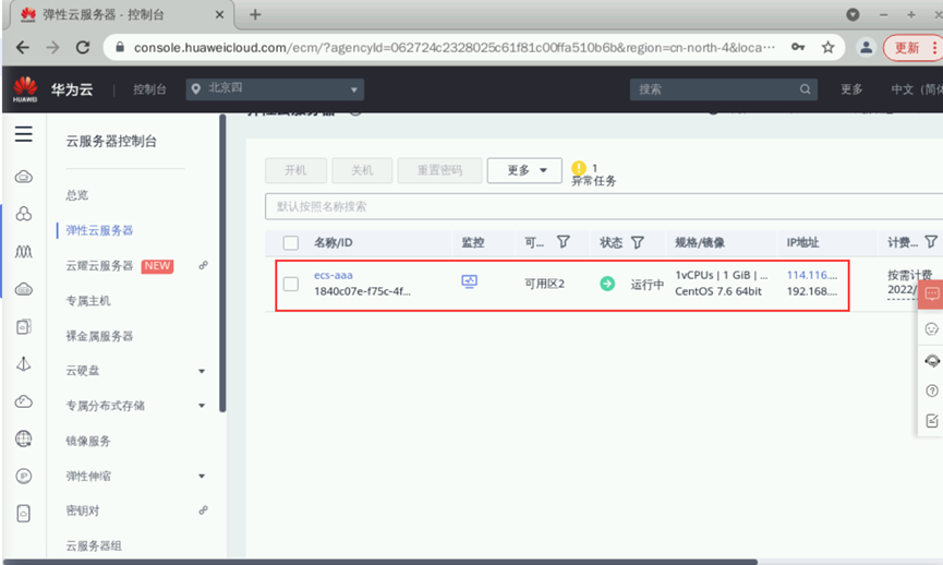 点击“立即购买” -> “返回云服务列表”,云服务器列表中此时有两台弹性云服务器,如下图所示:
