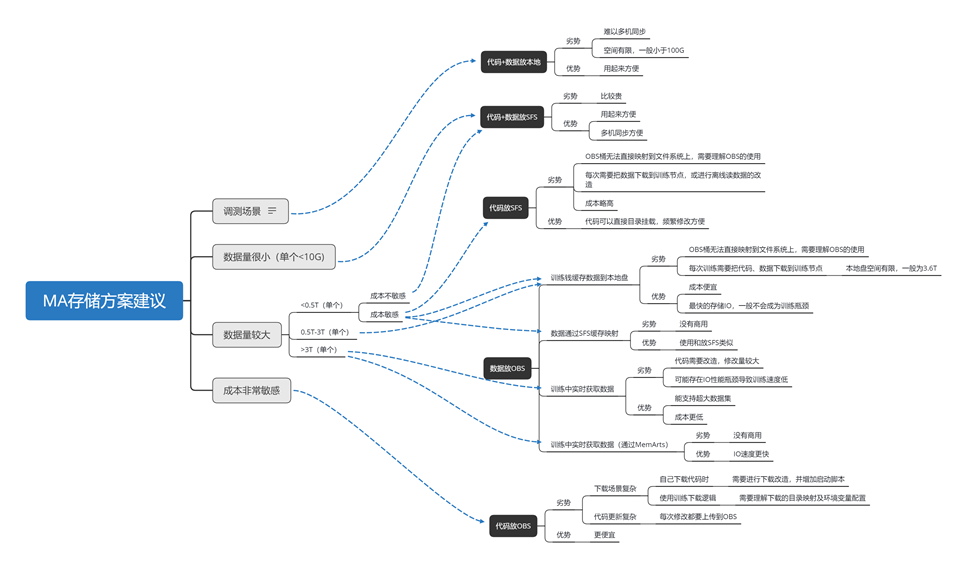 其次是数据部分,一般来说训练数据体量更大,并且总量会不断增加,但是已生成的数据集变动会很小。一般建议以OBS来进行承载数据,在多机训练场景下也有通过NFS来承载的实践。