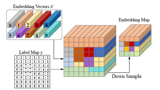 为了获得对目标域特征更准确的估计,我们参考贝叶斯理论,后验分布由先验和似然组成。在我们的设置中,似然来自目标数据集,没有足够的数据来保证准确的估计。解决方案是为每个类别引入信息先验,这些先验和域无关也不会受域差异的影响。我们找到两种先验,一种是one-hot编码,另外一种借助word2vec[2]来为每个类别生成编码。这样每个类别都有一个先验编码向量,然后根据每个图像的标签,按位置替换为先验编码,构成一个先验编码图,如图2。然后我们将其和网络提取的是视觉特征进行约束。为了让视觉特征更多保留和类别语义相关的信息减少域相关的信息,二者通过简单转换后用L2 loss拉近。这就是我们新引入的DAP loss。