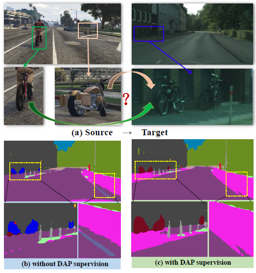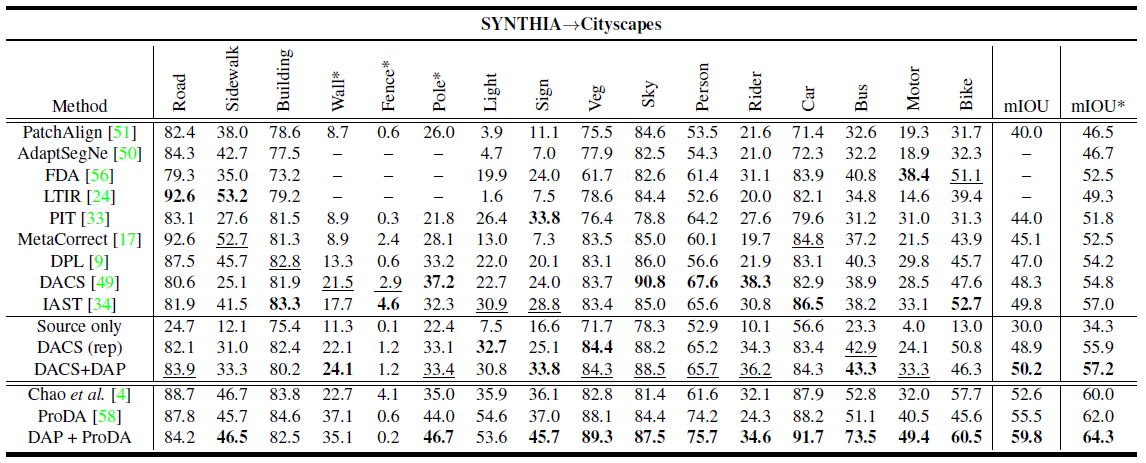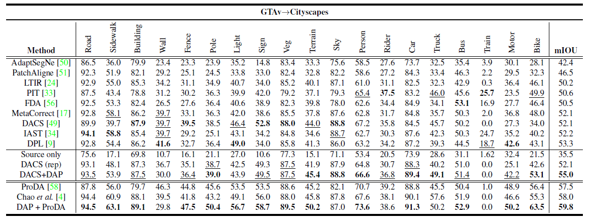 我们首先在从GTAv到Cityscapes的域适应分割任务上评估DAP。DAP在19个级别上达到55.0%的平均IOU,这个结果超过基线2.9%,也优于其他单阶段和单模型训练的方法。我们将DAP的输出作为伪标签输入ProDA的第1阶段,然后保持ProDA[6]第2和第3阶段训练方法不变。我们将结果提升了2.3%,是目前最高的精度。