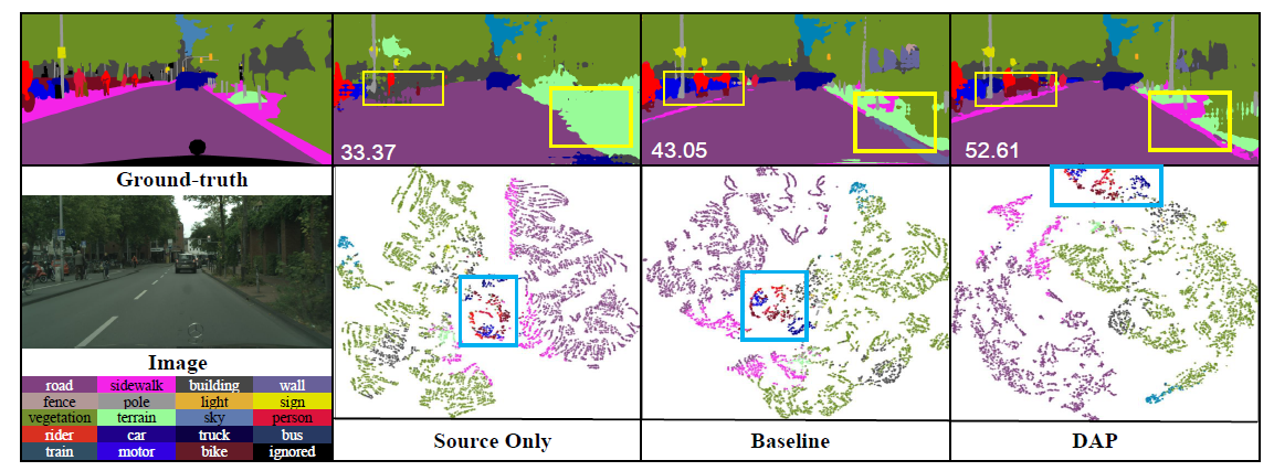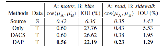 在GTAv到Cityscapes迁移实验中,自行车和摩托车的细分iou分别从42.6%、25.1%提高到53.1%、42.2%。从SYNTHIA到Cityscapes,这两个类别平均提升2.4%。我们在图6中可视化了一个分割的例子。除了定性观察自行车与摩托车、道路与人行道的区分改善之外,我们还注意到这一改善背后的原因是这些易混淆类别的特征分布得到改善。这与表1中显示的统计数据一致,表明DAP减少了自行车和摩托车的估计分布以及道路和人行道之间的IOU。
