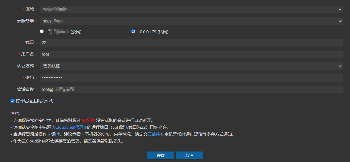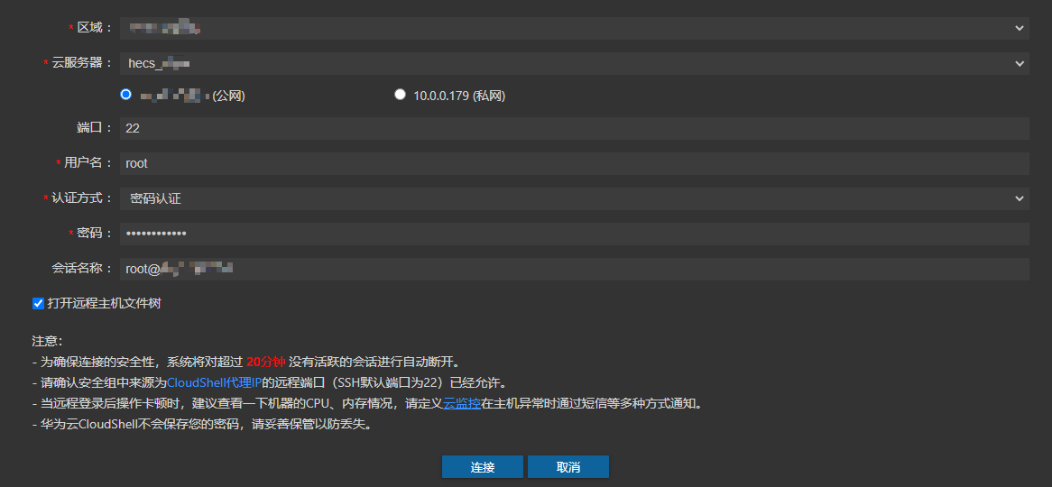 首次登录,默认会打开CloudShell配置向导,输入云服务器的相关参数进行连接。