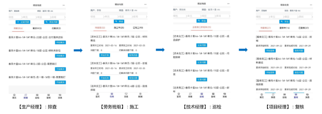 - 施工质量得到保证:劳务人员实时报工、项目经理有序巡检,进展实时共享,巡检效率成倍提高。