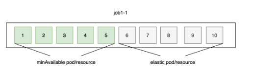 弹性作业允许Job的副本数在[min, max]范围弹性伸缩,其中min为job的minAvailable,max为job的副本数,弹性调度会优先为minAvailable Pod分配资源,保障每个应用的最小资源需求优先满足,如果有闲置资源,调度器会为Elastic Pod分配资源,加速计算进程。资源紧张时,调度器优先抢占Elastic Pod实现缩容。同时调度器也会平衡不同优先级的弹性作业间的资源分配,如支持高优先级作业抢占低优先级作业的弹性副本部分的资源。