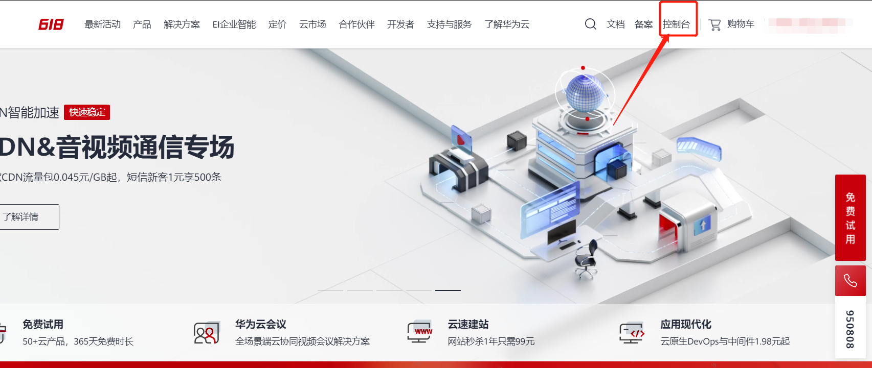 - 登录华为云后台,点击`控制台`。