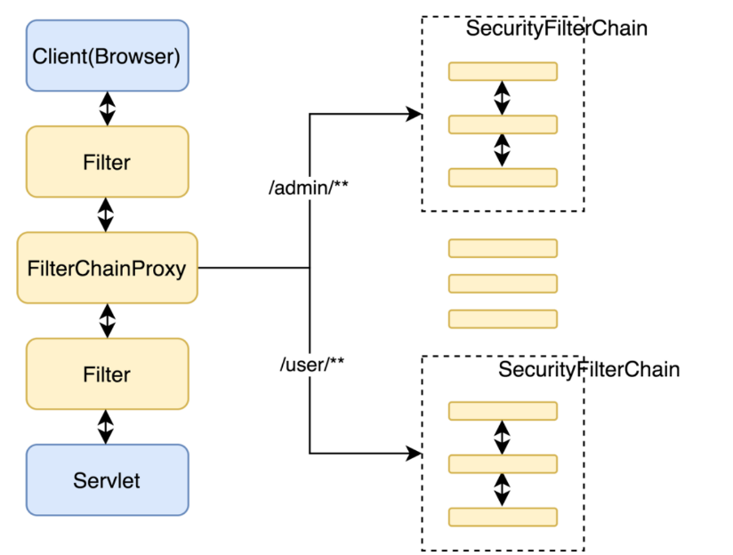 在Spring Security中,认证、授权等功能都是基于过滤器来完成的。开发者所见到的Spring Security提供的功能,都是通过这些过滤器来实现的,这些过滤器按照既定的优先级排列,最终形成一个过滤器链。开发者也可以自定义过滤器,并通过@Order注解去调整自定义过滤器在过滤器链中的位置。需要注意的是,默认过滤器并不是直接放在Web项目的原生过滤器链中,而是通过一个FilterChainProxy来统一管理。Spring Security中的过滤器链通过FilterChainProxy嵌入到Web项目的原生过滤器链中。在Spring Security中,这样的过滤器链不仅仅只有一个可能会有多个。当存在多个过滤器链时,多个过滤器链之间要指定优先级,当请求到达后,会从FilterChainProxy进行分发,先和哪个过滤器链匹配上,就用哪个过滤器链进行处理。